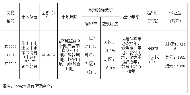 九、自本次公告起至网上挂牌截止期间,如有关于本宗地竞买文件的修改、澄清、说明等将通过网上交易系统以及佛山市南海区人民政府网发布,请有意参与竞买者密切留意。其它未尽事宜,详见本宗地的网上挂牌出让文件。