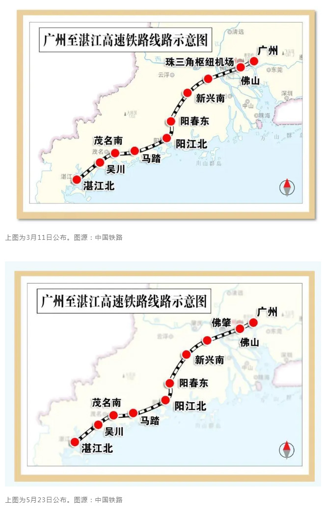 今年3月11日,中国国家铁路集团有限公司在其官方公众号上发布广湛高铁建设进展时,所公布的广州至湛江高速铁路线路示意图仍显示,珠三角枢纽机场站命名为珠三角枢纽机场站;但就在5月23日,中国国家铁路集团有限公司在其官方公众号上发布广湛高铁建设进展时,最新公布的广州至湛江高速铁路线路示意图显示,珠三角枢纽机场站已更名为佛肇站。