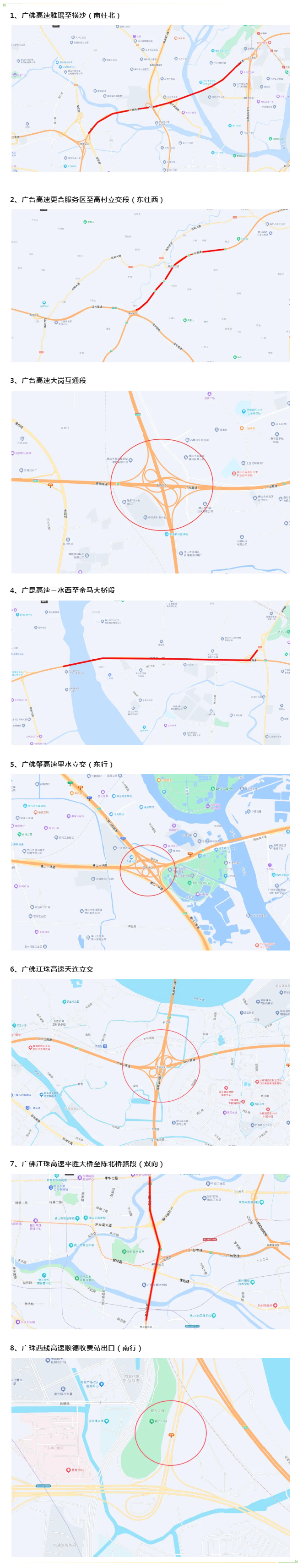 据交警部门研判,交通流高峰时段,佛山市内以下高速公路车流量将明显增多,容易引发交通缓行情况↓↓↓