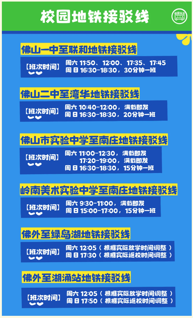 从6月7日起,禅城区开通6条“校园地铁接驳线”,覆盖佛山一中、佛山二中、佛山市实验中学、佛山市外国语学校 (湖涌校区)和岭南美术实验中学等5所学校。“校园地铁接驳线”根据学校周末集中离校及返校时间,提供学校至地铁站的直达接驳服务。