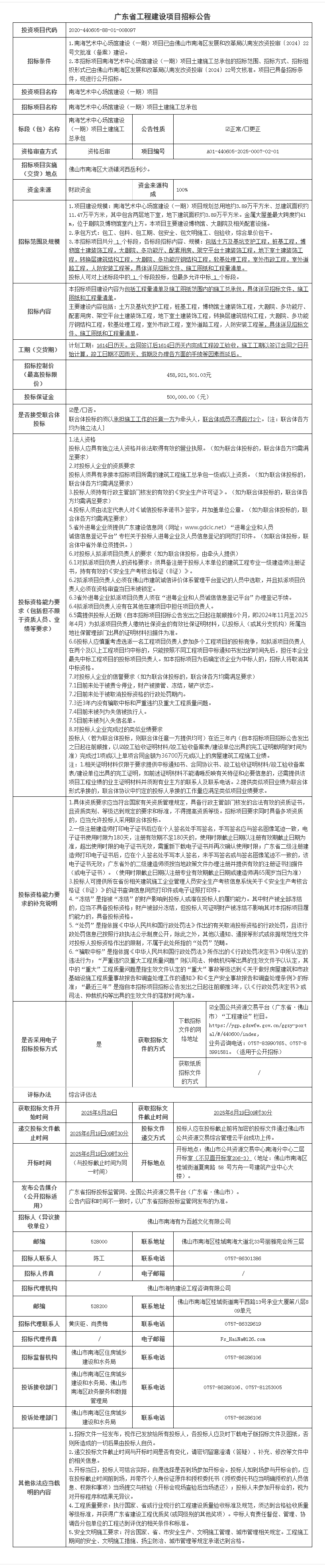 南海艺术中心场馆建设(一期)项目土建施工总承包招标公告