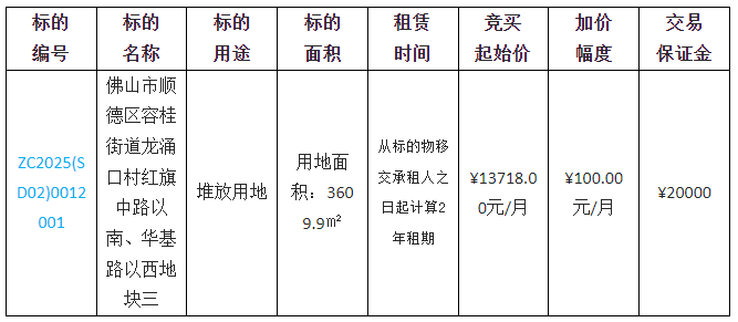 出租方采用网上竞价方式出租位于佛山市顺德区容桂街道龙涌口村红旗中路以南、华基路以西地块三租赁权竞投,欢迎符合资格的竞买人参与竞价。