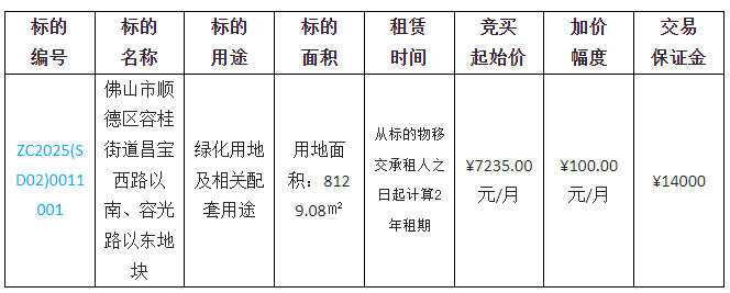 出租方采用网上竞价方式出租位于佛山市顺德区容桂街道昌宝西路以南、容光路以东地块租赁权竞投,欢迎符合资格的竞买人参与竞价。