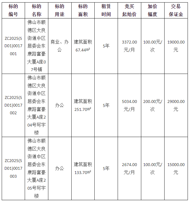 1.本项目的交易保证金为:佛山市顺德区大良街道中区居委会东康路富豪大厦A座07号铺:(大写)壹万玖仟元整(小写:¥19000.00);佛山市顺德区大良街道中区居委会东康路富豪大厦A座204号写字楼:(大写)贰万玖仟元整(小写:¥29000.00)、佛山市顺德区大良街道中区居委会东康路富豪大厦A座205号写字楼(大写)壹万伍仟元整(小写:¥15000.00)。