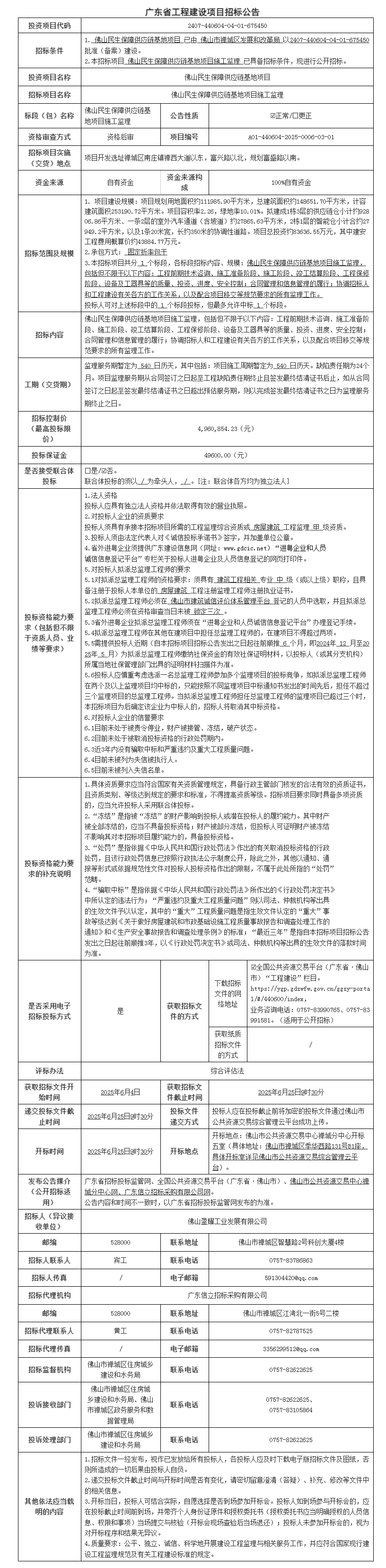 佛山民生保障供应链基地项目施工监理招标公告
