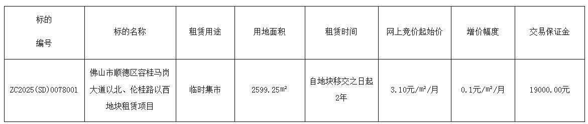 广东明润工程咨询有限公司受广东顺控物业发展有限公司委托采用网上竞价方式出租位于顺德区容桂马岗大道以北、伦桂路以西地块的使用权,欢迎符合资格的竞买人参与竞价。