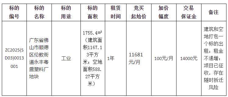 1.项目名称:佛山市顺德区伦教街道永丰粤盛塑料厂地块公开招租项目