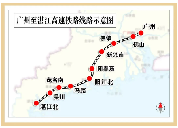 广湛高铁线路自广州站引出,向西经佛山、肇庆、云浮、阳江、茂名、湛江,终至湛江北站,全长401公里。全线共设佛山站、佛肇站、新兴南站、阳春东站、阳江北站、马踏站、茂名南站、吴川站及湛江北站9座车站站房,其中佛山境内有两座车站,分别是佛山站、佛肇站。
