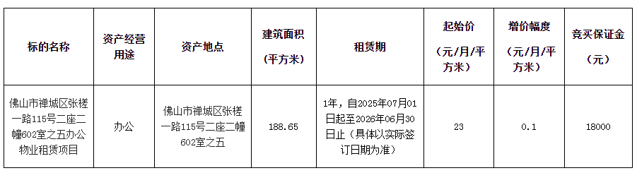 6.优先承租权情况:佛山市梧桐苑企业管理咨询有限公司为本项目优先承租权权利人(注:优先承租权权利人需以自己的名义办理本标的的竞买申请、交纳竞买保证金,取得网上报价权限,在其他竞买人报价后,可点击行使优先权,同等价位优先承租权权利人享有优先权。优先承租权权利人没有办理竞买申请并交纳竞买保证金的,视为放弃优先承租权)。