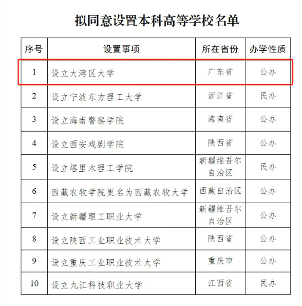 6月11日,教育部官方发布公示,拟同意设置大湾区大学等10所学校,公示时间为2025年6月11日至6月17日。