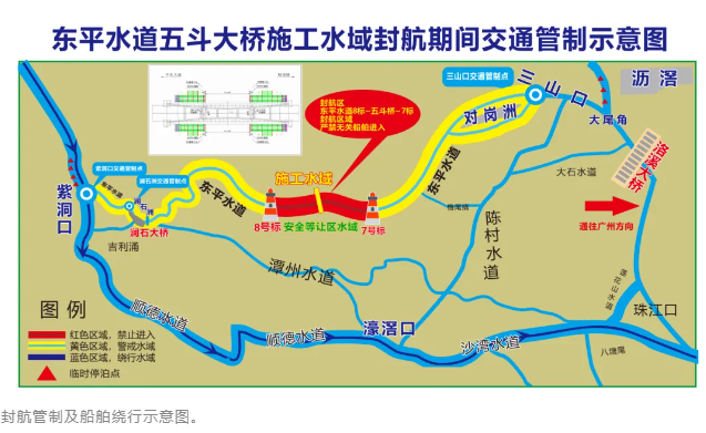 为保障东平水道五斗大桥重建项目施工期间通航环境安全,海事部门将于2025年6月五斗大桥吊装施工作业期间对东平水道相关水域实施封航交通管制,具体内容如下: