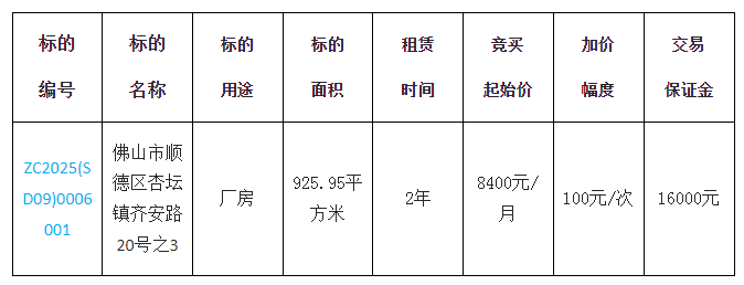 佛山市顺德区杏盈市政投资管理有限公司委托采用网上竞价方式出租位于佛山市顺德区杏坛镇齐安路20号之3 使用权,欢迎符合资格的竞买人参与竞价。