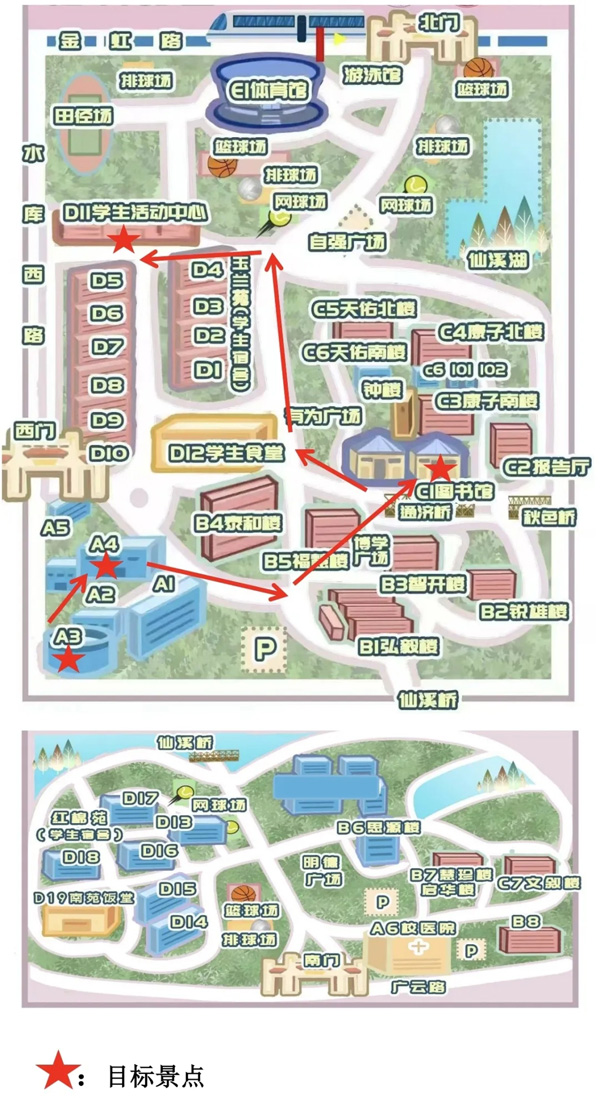 筑梦未来线路提供导览服务,师兄师姐化身导览员带着大家走校园。南门服务点集合,分别在9:30、10:00、10:30、11:00分四批次游校园!爱自然风光走自然生态线,对前沿科技感兴趣必选专业特色线(重点实验室全开放!),领略红色文化就选党建思政线。