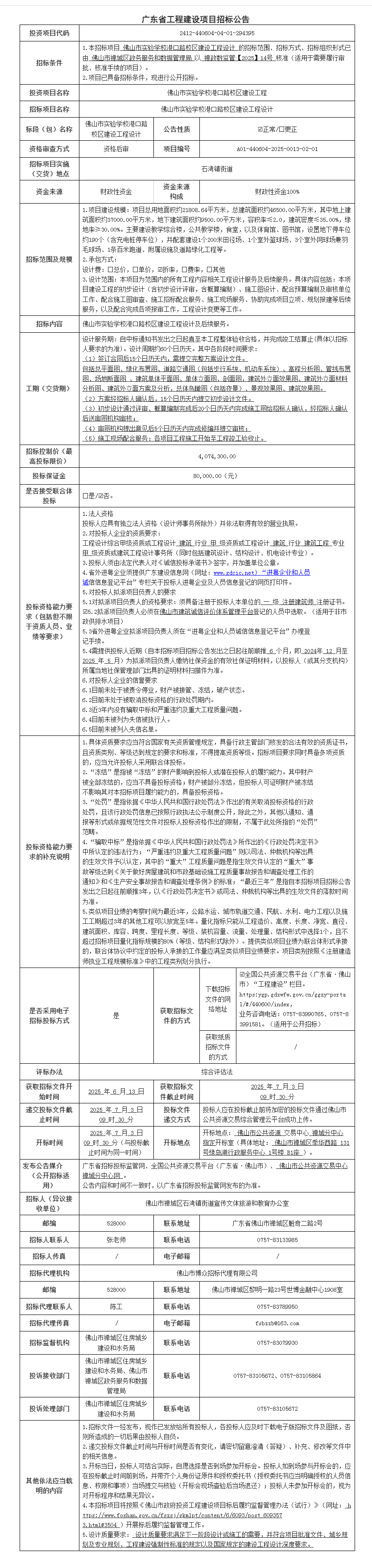佛山市实验学校港口路校区建设工程设计招标公告