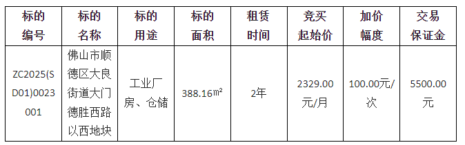 佛山市顺德区景良投资发展有限公司采用网上竞价方式出租位于佛山市顺德区大良街道大门德胜西路以西地块,欢迎符合资格的竞买人参与竞价。