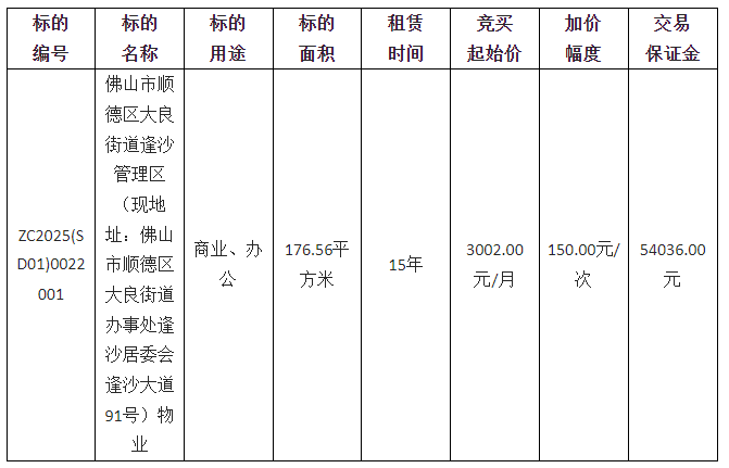 佛山市顺德区大良德良物业管理公司采用网上竞价方式出租位于佛山市顺德区大良街道逢沙管理区(现地址:佛山市顺德区大良街道办事处逢沙居委会逢沙大道91号)物业,欢迎符合资格的竞买人参与竞价。
