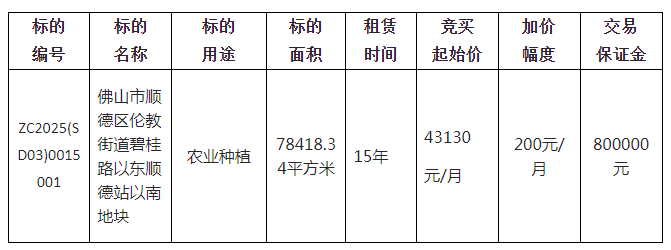 佛山市顺德区伦安安防技术有限公司采用网上竞价方式出租位于佛山市顺德区伦教街道碧桂路以东顺德站以南地块使用权,欢迎符合资格的竞买人参与竞价。