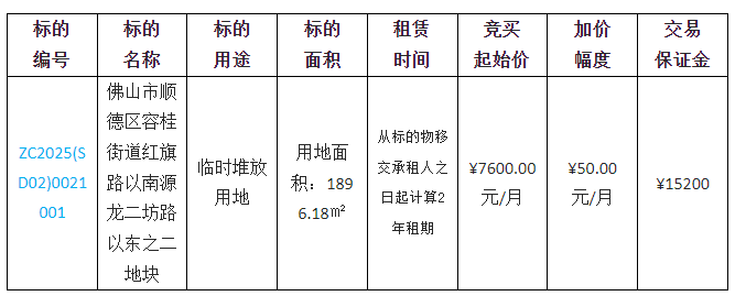 出租方采用网上竞价方式出租位于佛山市顺德区容桂街道红旗路以南源龙二坊路以东之二地块租赁权竞投,欢迎符合资格的竞买人参与竞价。
