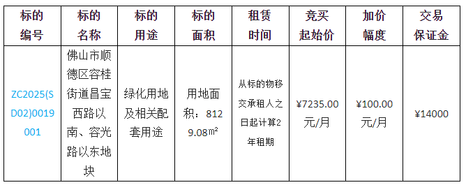 出租方采用网上竞价方式出租位于佛山市顺德区容桂街道昌宝西路以南、容光路以东地块租赁权竞投(二次),欢迎符合资格的竞买人参与竞价。