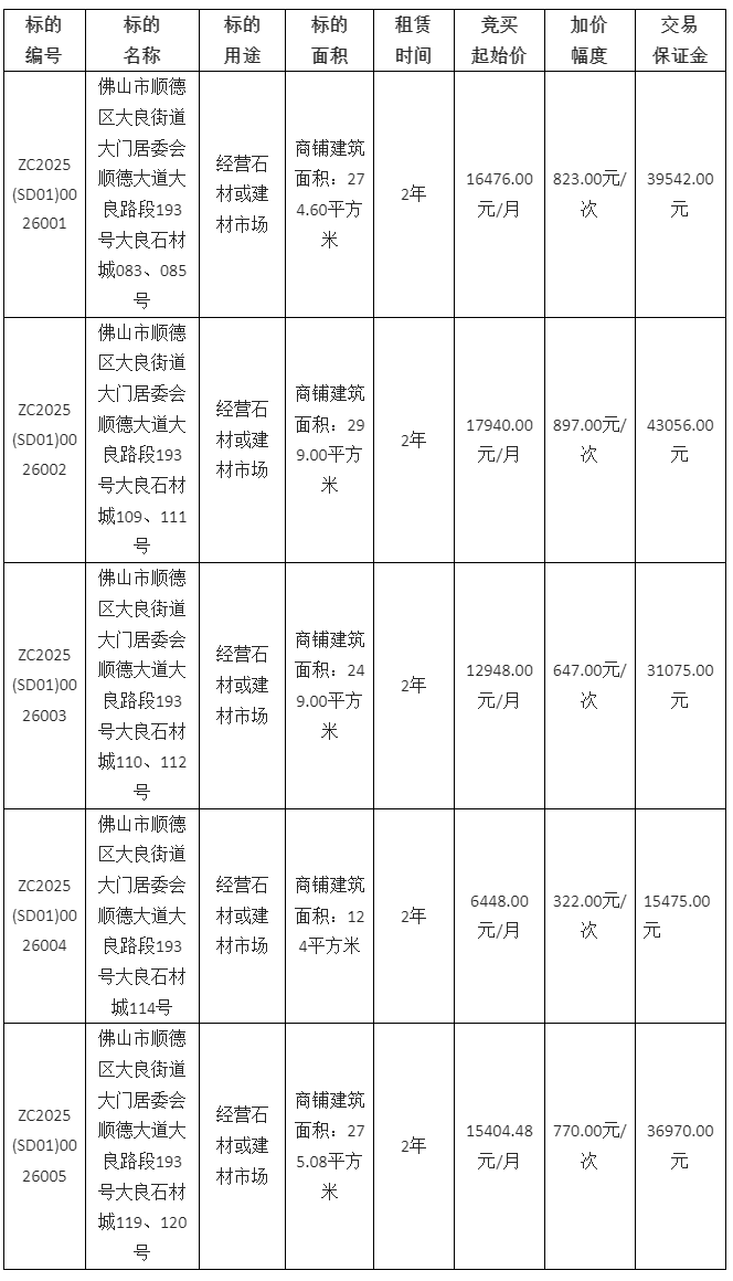 佛山市顺德区盈良物业管理有限公司采用网上竞价方式出租位于佛山市顺德区大良街道大门居委会顺德大道大良路段193号大良石材城083、085号等5宗物业,欢迎符合资格的竞买人参与竞价。