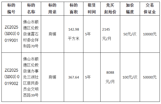 1.项目名称:佛山市顺德区伦教街道霞石村委会祥和路70号等2宗公有物业公开招租项目