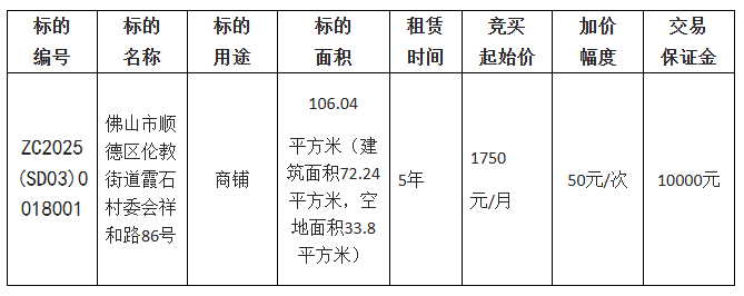 1.本项目的交易保证金为人民币:佛山市顺德区伦教街道霞石村委会祥和路86号(大写)壹万元整(小写:¥ 10000);