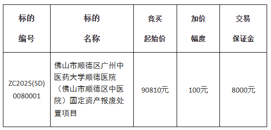 广州中医药大学顺德医院(佛山市顺德区中医院)采用网上竞价方式出售位于佛山市顺德区大良街道金沙大道12号的一批待报废固定资产所有权,欢迎符合资格的竞买人参与竞价。
