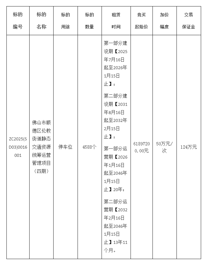 广东人信工程咨询有限公司受佛山市顺德区伦教街道市政管理处委托采用网上竞价方式出租位于佛山市顺德区伦教街道内的佛山市顺德区伦教街道静态交通资源统筹运营管理项目(四期)使用权,欢迎符合资格的竞买人参与竞价。
