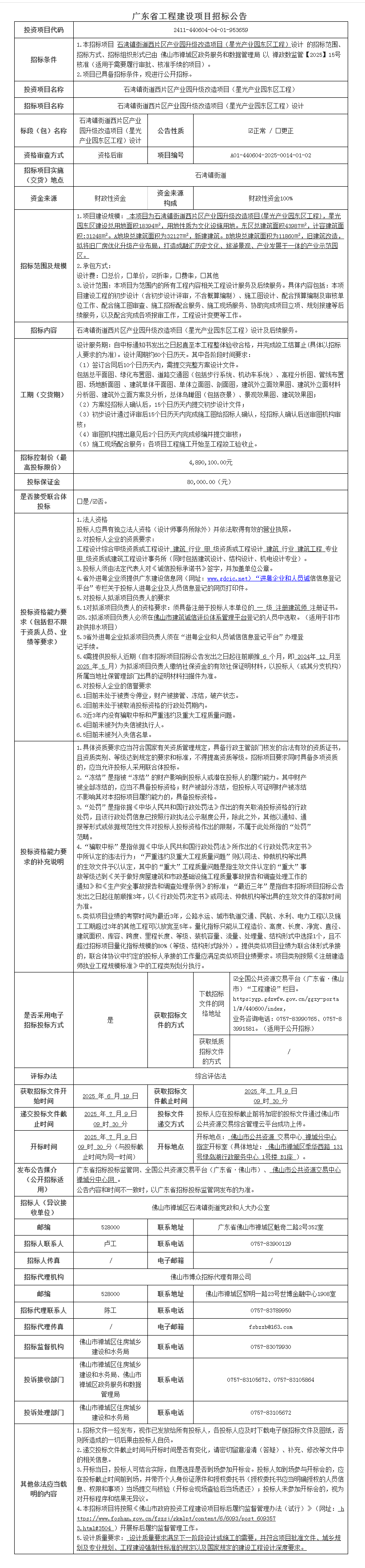 禅城石湾镇街道西片区产业园升级改造项目(星光产业园东区工程)设计招标公告