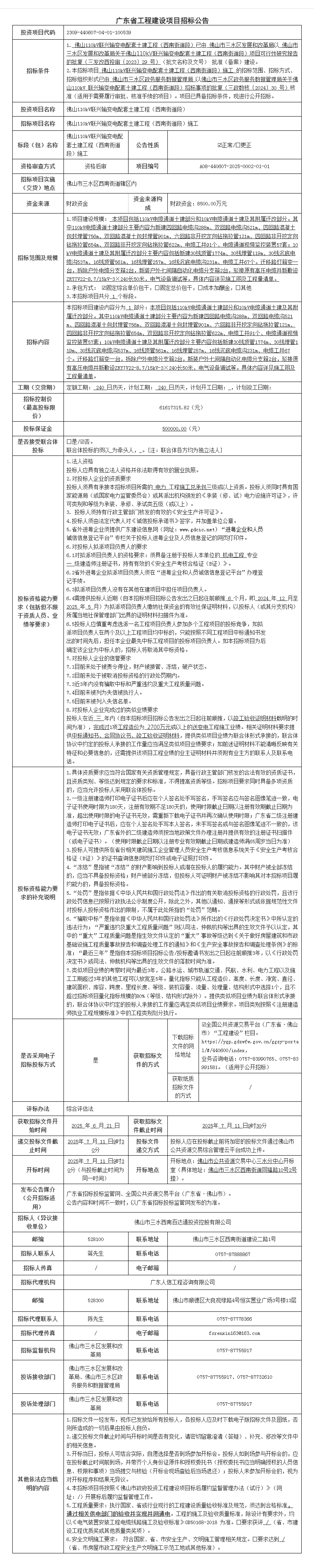 佛山110kV联兴输变电配套土建工程(西南街道段)施工招标公告