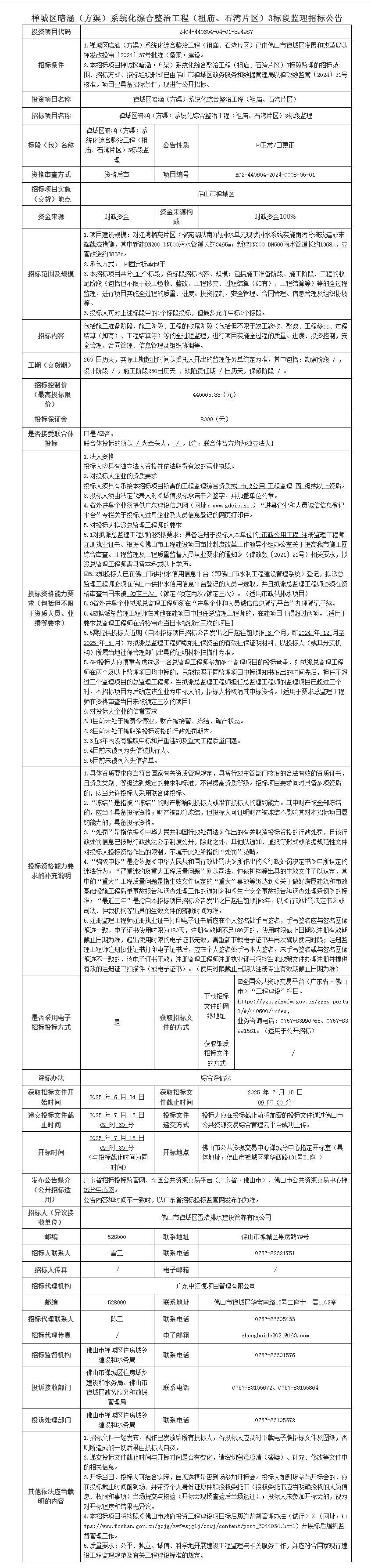 禅城区暗涵(方渠)系统化综合整治工程(祖庙、石湾片区)3标段监理招标公告