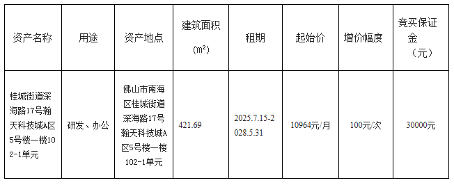 南海桂城街道深海路17号瀚天科技城A区5号楼一楼102-1单元租赁公告