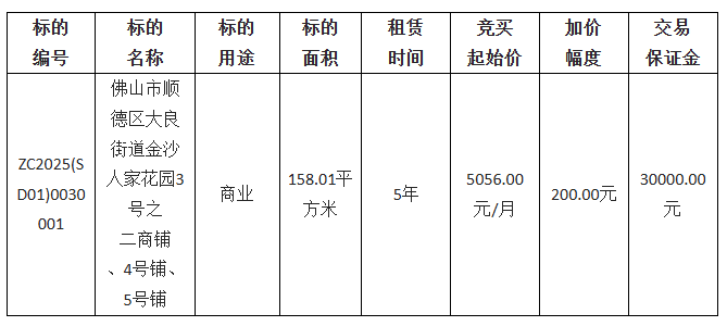 佛山市顺德区景良投资发展有限公司采用网上竞价方式出租位于佛山市顺德区大良街道办事处五沙居委会顺园东路1号金沙人家花园3号之二商铺、4号铺、5号铺物业,欢迎符合资格的竞买人参与竞价。