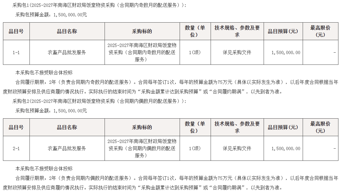 项目名称:2025-2027年南海区财政局饭堂物资采购