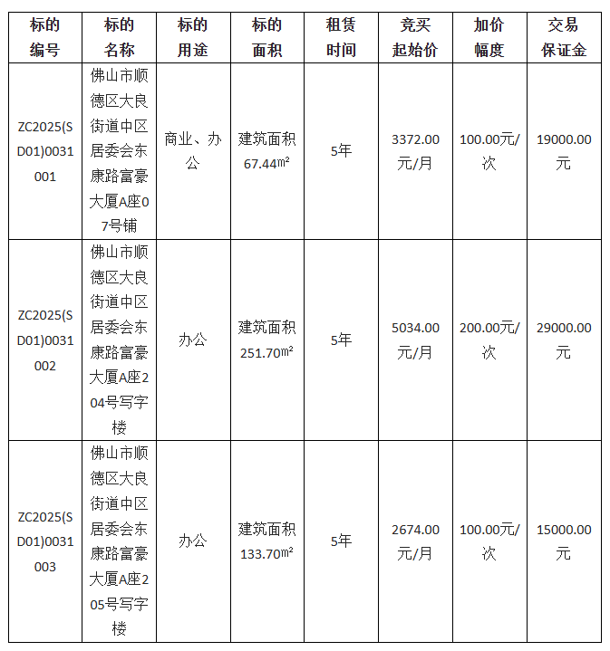 1.本项目的交易保证金为:佛山市顺德区大良街道中区居委会东康路富豪大厦A座07号铺:(大写)壹万玖仟元整(小写:¥19000.00);佛山市顺德区大良街道中区居委会东康路富豪大厦A座204号写字楼:(大写)贰万玖仟元整(小写:¥29000.00)、佛山市顺德区大良街道中区居委会东康路富豪大厦A座205号写字楼(大写)壹万伍仟元整(小写:¥15000.00)。