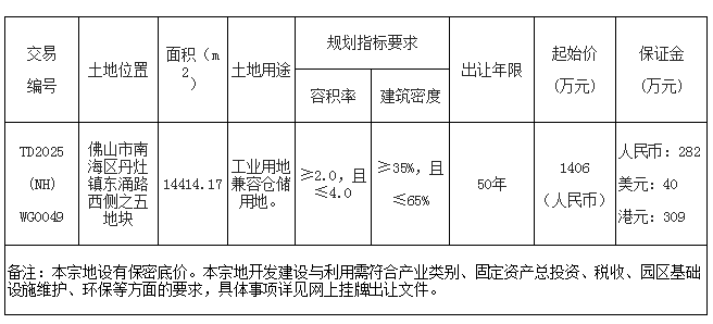 八、自本次公告起至网上挂牌截止期间,如有关于本宗地竞买文件的修改、澄清、说明等将通过网上交易系统以及佛山市南海区人民政府网发布,请有意参与竞买者密切留意。其它未尽事宜,详见本宗地的网上挂牌出让文件。