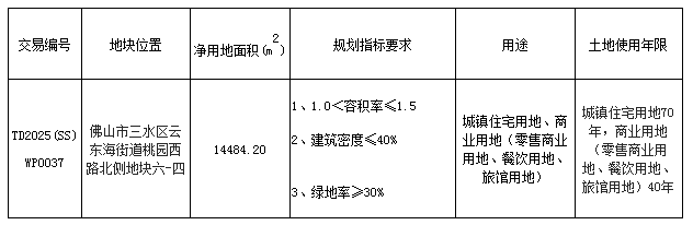 五、有意参与竞买者可于2025年6月30日后登录网上交易系统下载TD2025(SS)WP0037地块的《佛山市三水区国有建设用地使用权网上拍卖出让文件》。