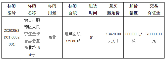 佛山市顺德区景良投资发展有限公司采用网上竞价方式出租位于佛山市顺德区大良街道金榜居委会鉴海北路134号,欢迎符合资格的竞买人参与竞价。