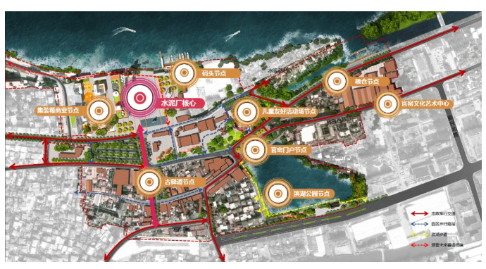 规划:项目以“一心一轴三核多节点”为骨架:“一心”是以官窑水泥厂为中心的工业文创艺术街区;“一轴”是以水泥厂—西市路为中轴线,串联核心功能区;“三核”包括共享办公、商业零售、官窑粮仓三大核心区;“多节点”是通过西南涌滨水走廊、沿江路及古驿道,串联历史人文建筑与公共空间。