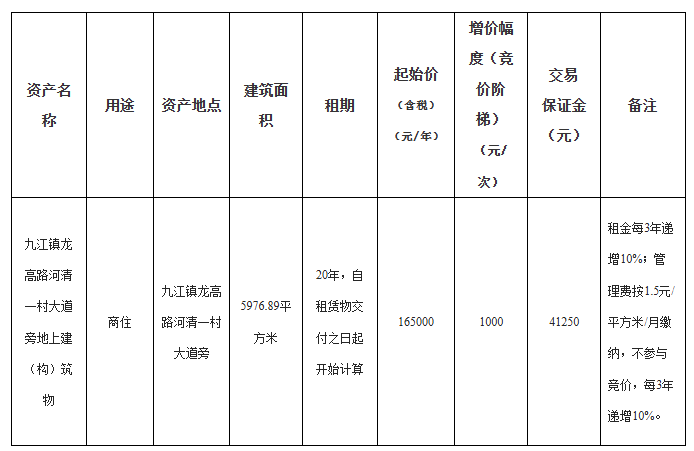 1.租金及管理费标准:租金含税价2.3元/平方米/月作为公开出租的租金起始价,以后每3年递增10%;物业管理费(不参与竞价)按照含税价1.5元/平方米/月标准缴纳,以后每3年递增10%。
