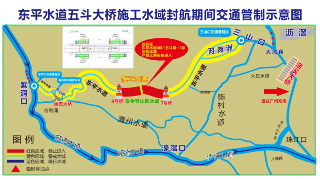 为保障东平水道五斗大桥重建项目施工期间通航环境安全,海事部门将于2025年7月五斗大桥吊装施工作业期间对东平水道相关水域实施封航交通管制,具体内容如下: