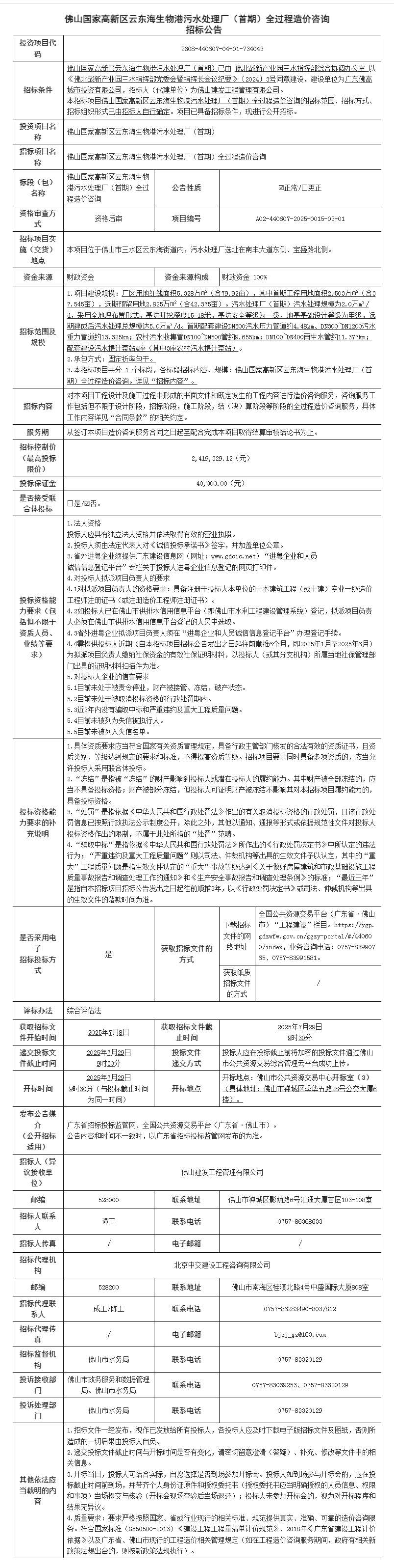 佛山国家高新区云东海生物港污水处理厂(首期)全过程造价咨询招标公告