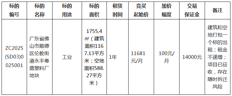 1.项目名称:佛山市顺德区伦教街道永丰粤盛塑料厂地块(第二次)公开招租项目