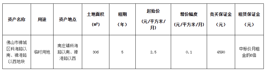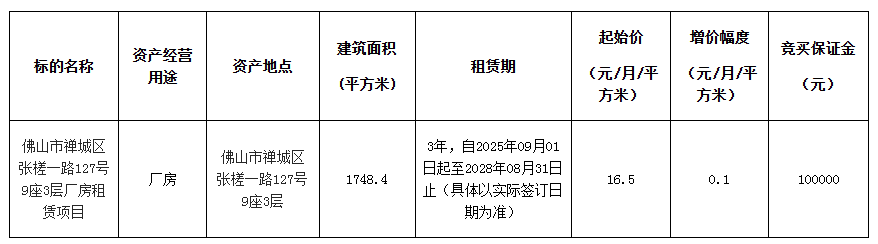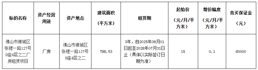 6.优先承租权情况:佛山市圣亚电子科技有限公司为本项目优先承租权权利人(注:优先承租权权利人需以自己的名义办理本标的的竞买申请、交纳竞买保证金,取得网上报价权限,在其他竞买人报价后,可点击行使优先权,同等价位优先承租权权利人享有优先权。优先承租权权利人没有办理竞买申请并交纳竞买保证金的,视为放弃优先承租权)。