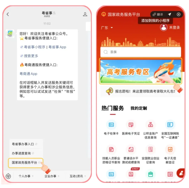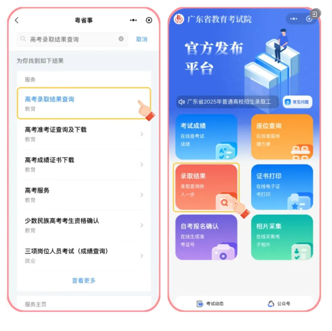 进入粤省事App或微信/支付宝小程序,首页搜索“高考录取结果查询”,点击“录取结果”即可查询。