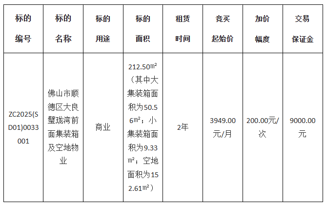 佛山市顺德区宏良建设发展有限公司采用网上竞价方式出租位于佛山市顺德区大良璧珑湾前面集装箱及空地,欢迎符合资格的竞买人参与竞价。