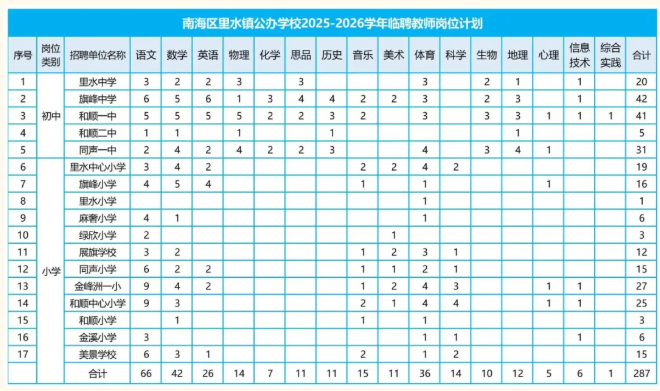 根据工作需要,佛山市南海区里水镇公办学校2025-2026学年计划招聘临时聘用专任教师。