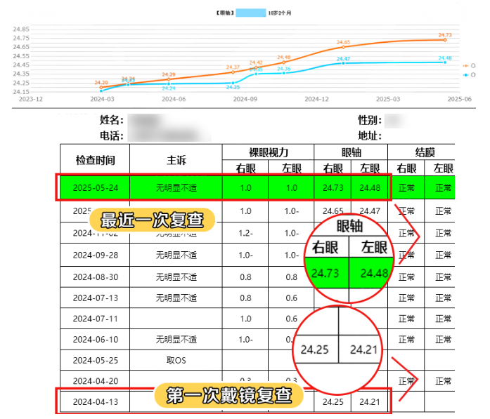 在随后的随访复诊中,2024年12月至2025年5月近半年时间里,悦悦右眼眼轴仅增长了0.08毫米,左眼几乎零增长(增长0.01毫米)!悦悦父母悬着的心终于放下,脸上露出了满意的笑容。