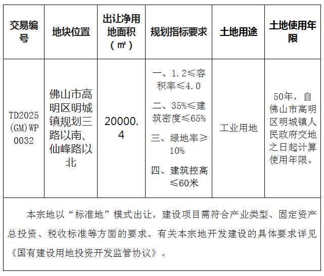 本块地其他规划建设要求按《高明区土地使用规划条件》(佛规明设函〔2025〕0060号)执行。