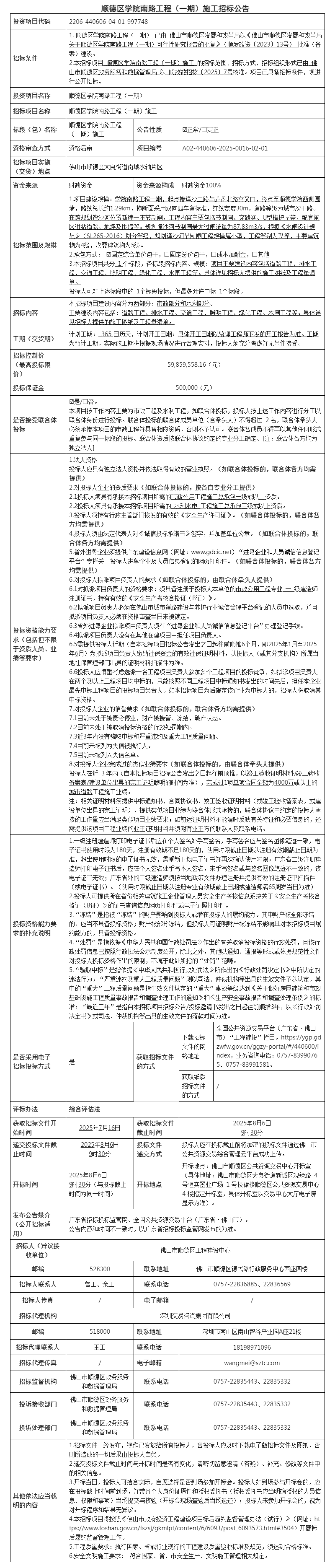 概述:本招标项目 顺德区学院南路工程(一期)施工 的招标范围、招标方式、招标组织形式已由 佛山市顺德区政务服务和数据管理局 以 顺政数招核〔2025〕7号核准......